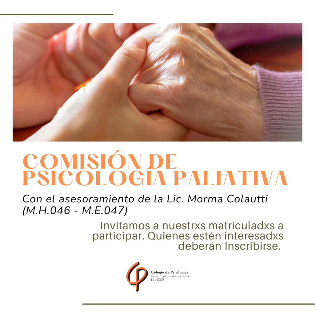 Invitamos a nuestrxs matriculadxs a participar de la recientemente constituida Comisión de Psicología Paliativa, asesorada por la Lic. Norma Colautti, (M.H.046 – M.E.047), y/o de las actividades a desarrollar por parte de la misma. Esta comisión busca abordar las particularidades del acompañamiento psicológico en cuidados paliativos, promover la formación, la derivación entre profesionales especializadxs y la difusión de buenas prácticas en esta área tan relevante de la Psicología. Quienes estén interesadxs deberán completar el siguiente formulario.