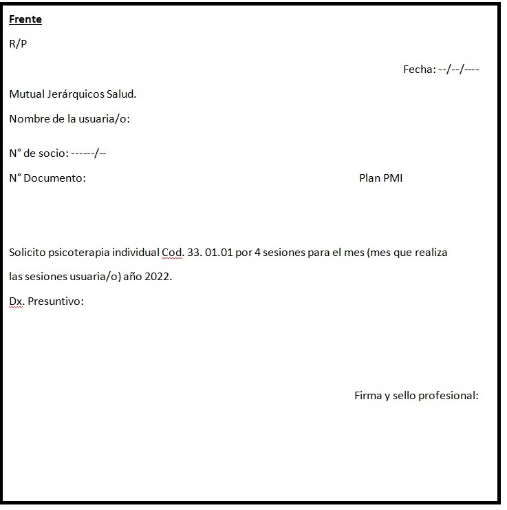 -330103, no requiere autorización previa, 4 sesiones mensuales (1 sesión semanal). A partir de la sesión número 3 (tres) agregar leyenda que sale en el modelo de RP detallado arriba. En este caso se lo solicita token, por cada sesión,  al afiliado/a que se le solicita la terapia familia/pareja y entre paréntesis al lado se escribe “Psicoterapia familia/pareja”.