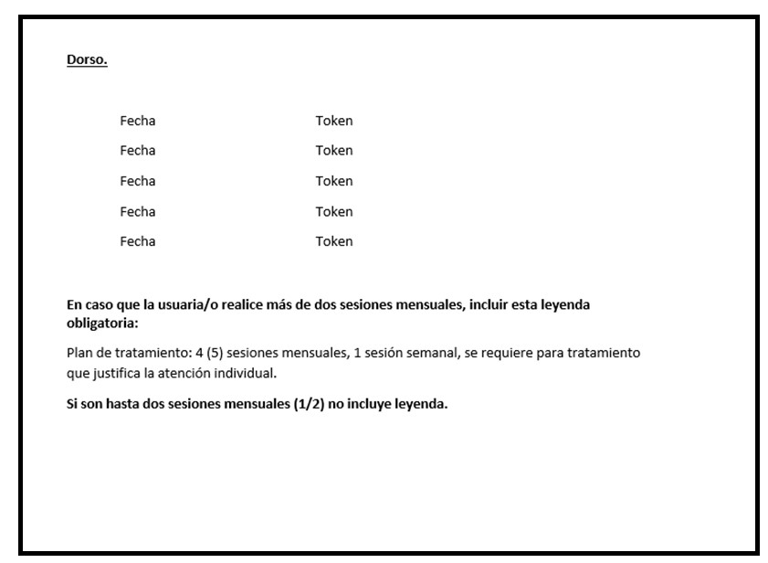 Presentación a la Obra Social: Realizar un R/P completo [Obra Social. Nombre y Apellido del paciente. Nº De afiliado (El número es el de socio ——/–)]. Prestación solicitada y cantidad. Diagnóstico codificado según DSM IV o CIE X, firma y sello del profesional, fecha del pedido), la fecha del pedido no puede ser posterior a la fecha de las sesiones y al dorso registrar el número de token (alfanumérico) con la fecha de asistencia y la leyenda como se muestra en la imagen más abajo. Este reemplazara la firma ológrafa del socio/a. Se presenta a través del sistema de autogestión a partir del 28 al día 8 inclusive del mes siguiente.
