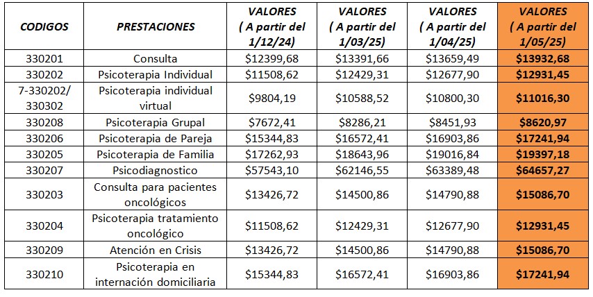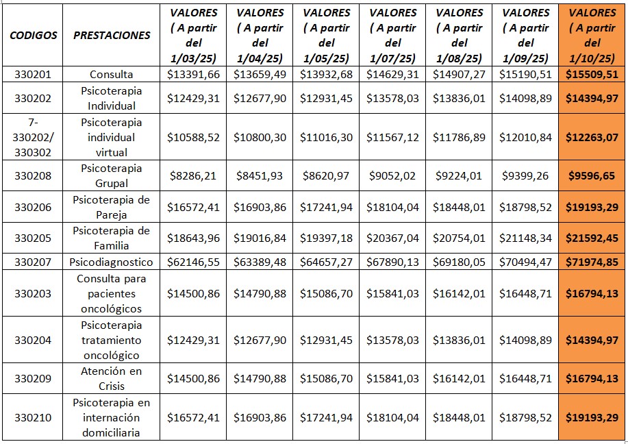 -Código 330201 «CONSULTA PSICOLOGICA» (siempre previo al inicio del tratamiento) 60 min por sesión hasta 2 (dos) por año para entrevista única de admisión y/o cambio de profesional. Modalidad Presencial.